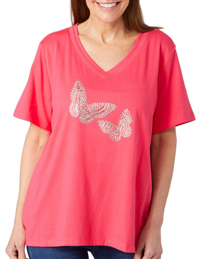 Add a touch of sparkle to your everyday look with this Women's Short Sleeve Embellished Tee. Crafted from a comfortable and durable 60/40 cotton-polyester blend, this top is designed for all-day ease and style. The embellishments on the front lend a subtle yet eye-catching detail that elevates its simple design. Top length measures approximately 24 in.