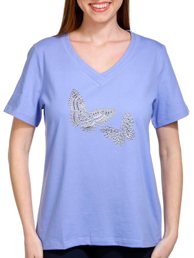 Add a touch of sparkle to your everyday look with this Women's Short Sleeve Embellished Tee. Crafted from a comfortable and durable 60/40 cotton-polyester blend, this top is designed for all-day ease and style. The embellishments on the front lend a subtle yet eye-catching detail that elevates its simple design. Top length measures approximately 24 in.