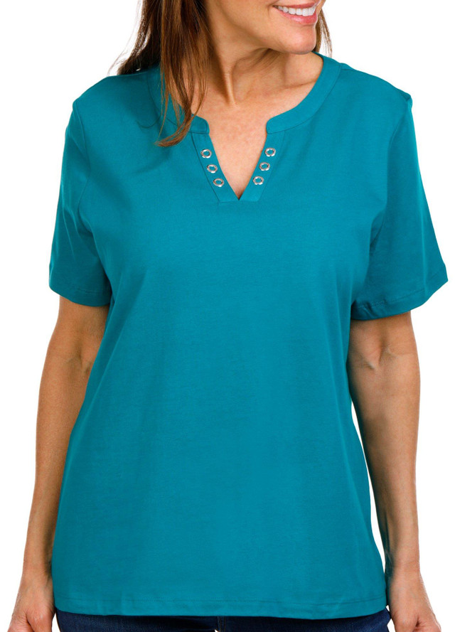 Elevate your casual wardrobe with this Short Sleeve Tee. Featuring a stylish split neck with grommet details, it adds a touch of edgy flair to a classic design. The solid color makes it a versatile piece that can be easily paired with jeans, shorts, or skirts. Perfect for both casual outings and relaxed days at home, this tee combines comfort and style effortlessly.