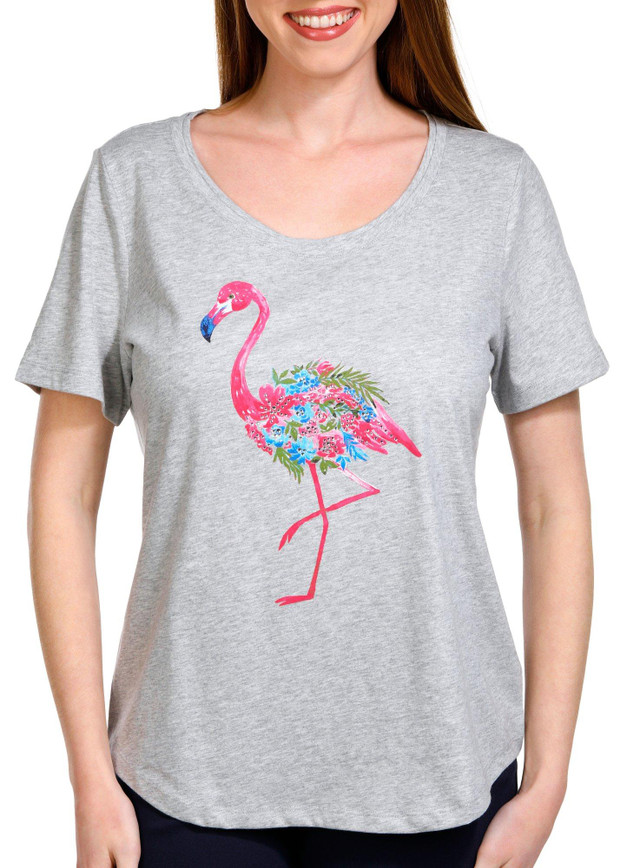 Brighten your wardrobe with our Women's Short Sleeve Painted Flamingo Top. Crafted from a soft blend of cotton and polyester, this top features a charming painted flamingo graphic design, enhanced with rhinestone embellishments for a touch of sparkle. The round neckline and short sleeves provide a comfortable and flattering fit, while the 24-inch length makes it perfect for casual outings. Add a splash of color and fun to your everyday style with this delightful top.
