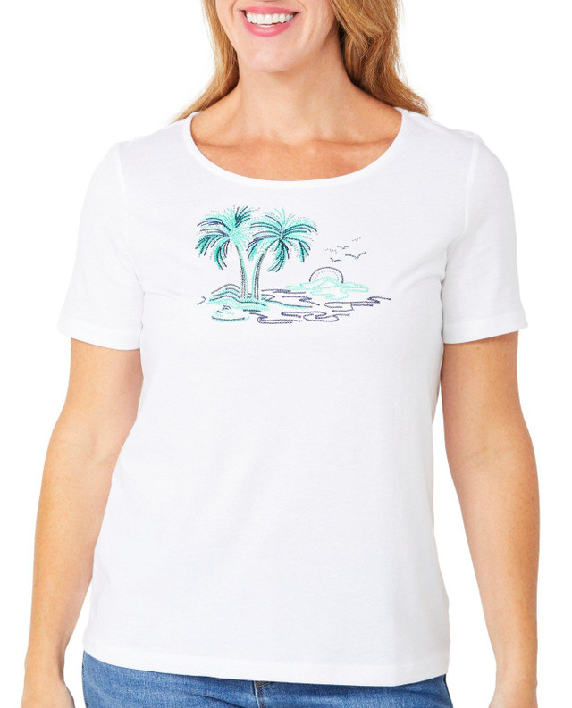 Let your style bloom with this elegant womens top. The scoop neckline and short sleeves offer everyday comfort while the palm tree design on soutached styling adds graceful texture. A soft statement piece for warm days and relaxed moments.
