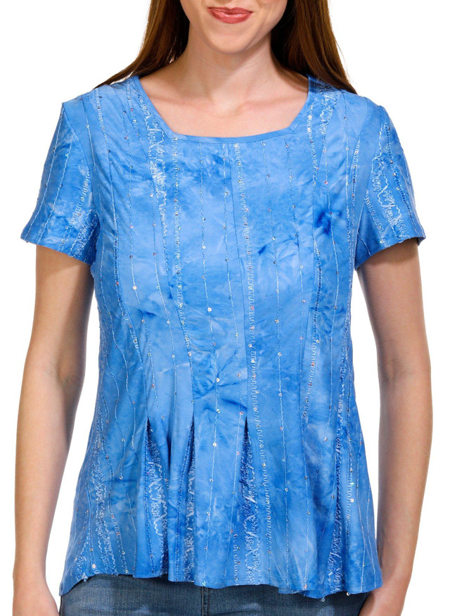 Add a touch of glamour to your wardrobe with our Women's Short Sleeve Square Neck Sequin Top. Made from a blend of polyester and spandex, this stylish top features a solid color adorned with an embellished sequin design. The square neckline and short sleeves offer a modern silhouette, while the pleated hem adds a sophisticated finish. Perfect for special occasions or a night out, this top effortlessly combines elegance and comfort.