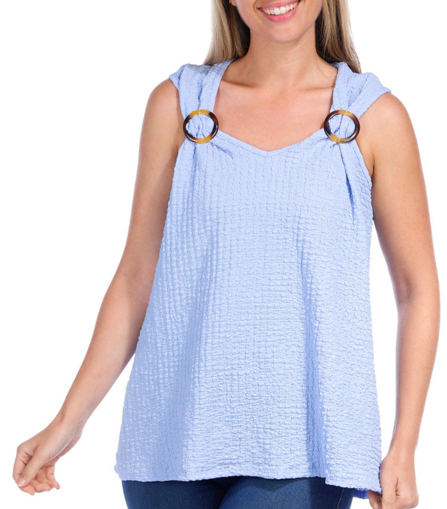 Stay cool and stylish in this Womens Sleeveless Crinkle Texture Top, featuring a breezy crinkle finish, solid color design, flattering v-neckline, and chic ring accents on the sleeves. Fabrication is 95% polyester and 5% spandex.