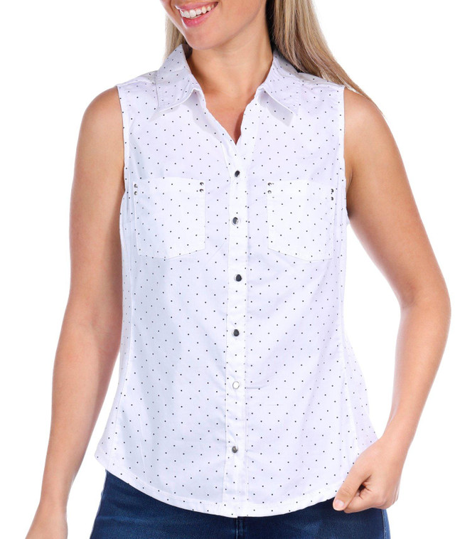 Effortlessly chic, this Womens Sleeveless Polka Dot Button Down Top features a classic collared neckline, playful polka dot print, front button closure, and handy chest slip pockets. Fabrication is 67% cotton, 29% polyester, and 4% spandex.