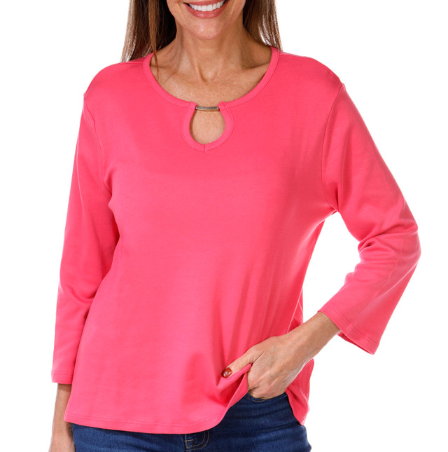 Coral Bay Womens Solid 3/4 Sleeve Metal Bar Neck Top