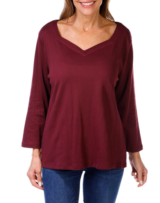 Elevate your everyday style with this women's solid top featuring a flattering sweetheart neckline and chic 3/4 sleeves. Soft, breathable fabric offers comfort and versatility, perfect for pairing with jeans or skirts for a polished, feminine look.