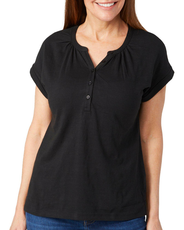 Elevate your everyday wardrobe with the Women's Solid Dolman Henley Short Sleeve Top, crafted from 100% cotton for ultimate comfort and breathability. This versatile top features a relaxed dolman sleeve design that effortlessly blends style and ease, making it perfect for casual outings or leisurely days. The classic Henley neckline adds a touch of timeless charm, while the soft, durable fabric ensures a flattering fit that feels as good as it looks.