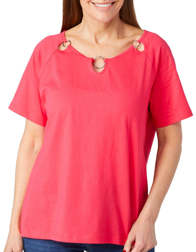Introducing the Women's Solid Triple Ring Top, crafted from 100% cotton for a soft and breathable feel. This elegant top features short sleeves, a round neckline with stylish triple ring accents, and a 25-inch length. Perfect for adding a touch of sophistication to your wardrobe, it's ideal for both casual and semi-formal occasions.
