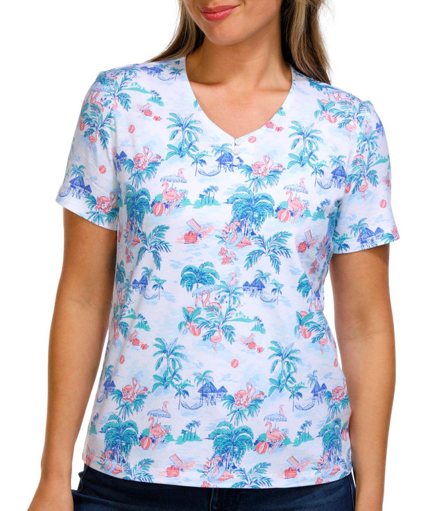 Add a splash of paradise to your wardrobe with our Womens Tropical Flamingo Henley Top. Made from a comfy cotton-spandex blend, it features a vibrant flamingo print, classic henley neckline, and short sleevesperfect for sunny days and laid-back vibes.
