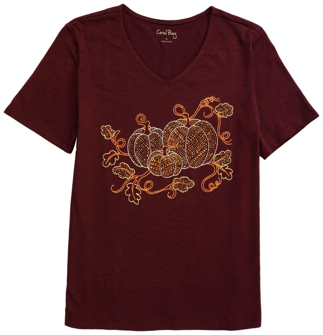 Celebrate the season in comfort with the Womens V-Neck Pumpkin Trio Embellished Top. Featuring a harvest motif of three pumpkins in a fall color palette, the design is accented with rhinestones for a festive touch. Ideal for casual fall outings or seasonal gatherings. Fabrication is 60% cotton, 40% polyester.