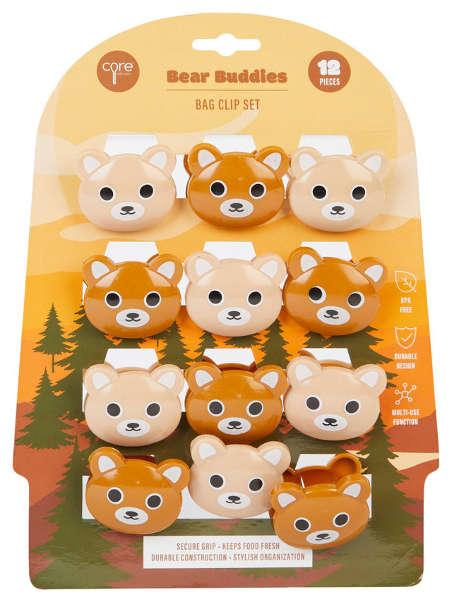 Keep snacks fresh with this adorable 12 pack Bear Buddies Bag Clip Set. Each clip features a cute bear design and a strong grip to seal bags tightly. Can also be used to organize your photos, notes, papers or receipts. Fun, functional, and great for organizing your kitchen.