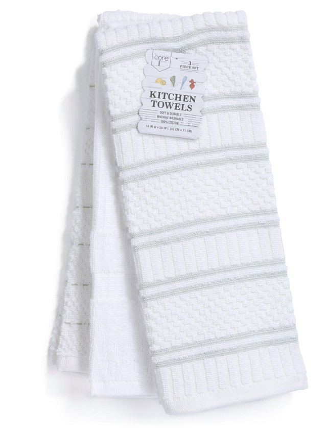 Refresh your kitchen essentials with this 3-pack of Kitchen Towels, featuring a mix of striped and textured designs for a stylish, functional touch. Made from soft, durable cotton, theyre gentle on hands and tough on messes. Machine washable and built to last, these towels bring everyday convenience with a pop of charm.