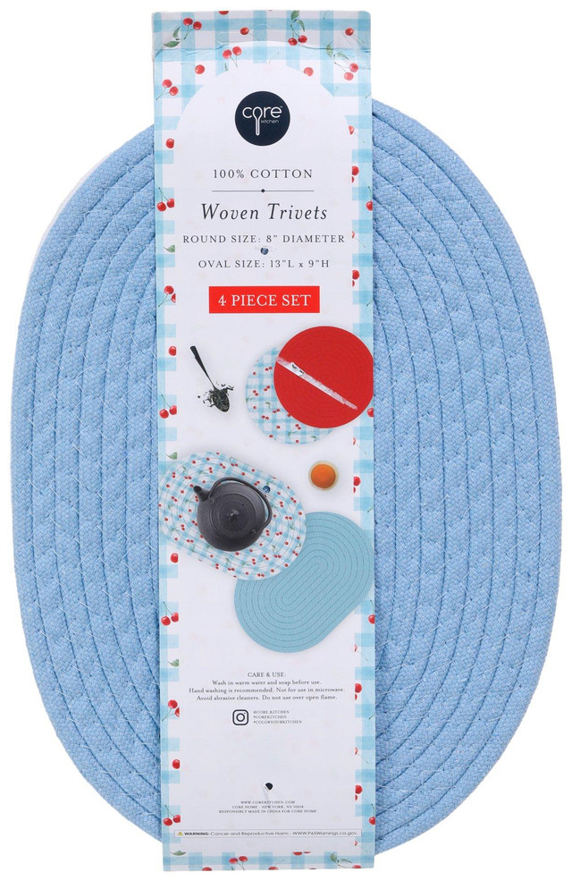 These trivets are the perfect size to protect your countertops and tables from hot dishes and pans. The natural cotton material offers excellent heat resistance while adding a touch of elegance to your dining experience. These versatile and charming cotton woven trivets are ideal for everyday use or special occasions, enhancing your kitchen décor with their simple yet sophisticated design. Measures approximately, Oval: 13 in x 9 in, Round: 8 in.