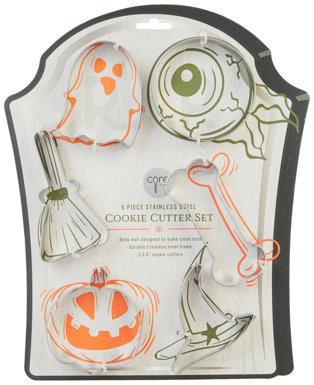 Create festive treats with the 6 pc Stainless Steel Cookie Cutter Set featuring Halloween-themed shapes including a tombstone, pumpkin, witch hat, ghost, circle, bone and broom. Each cutter offers sharp, defined edges for precise results in cookie dough, fondant or soft fruits. Durable and rust-resistant for repeated seasonal use. Hand wash and dry thoroughly after each use.