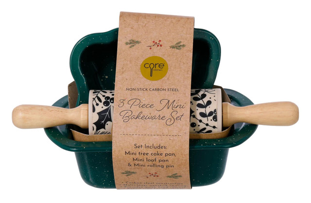Celebrate Christmas in the kitchen with this festive 3-piece mini bake set! Includes a non-stick carbon steel green mini loaf pan, green mini springform pan, and a bamboo rolling pin decorated with cute seasonal designs. Perfect for baking small treats with festive flair.