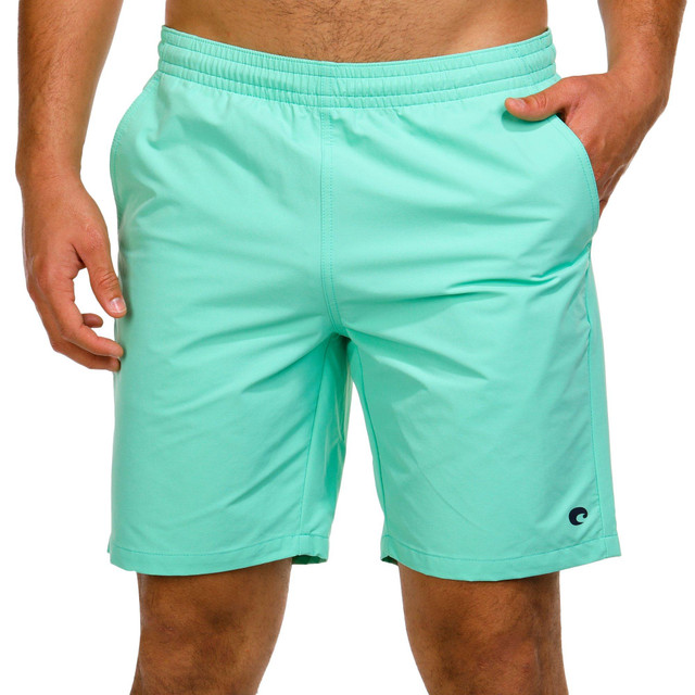 FEATURES: Elastic-waist drawstring shorts. Moisture-wicking. Stretch for extra mobility. 18 outseam, 7 inseam. Angled front pocket. Back patch pocket. 94% Nylon, 6% Spandex Machine wash cold, inside out, with like colors. Tumble dry low. Iron inside out on low setting. Do not use bleach. Do not dry clean