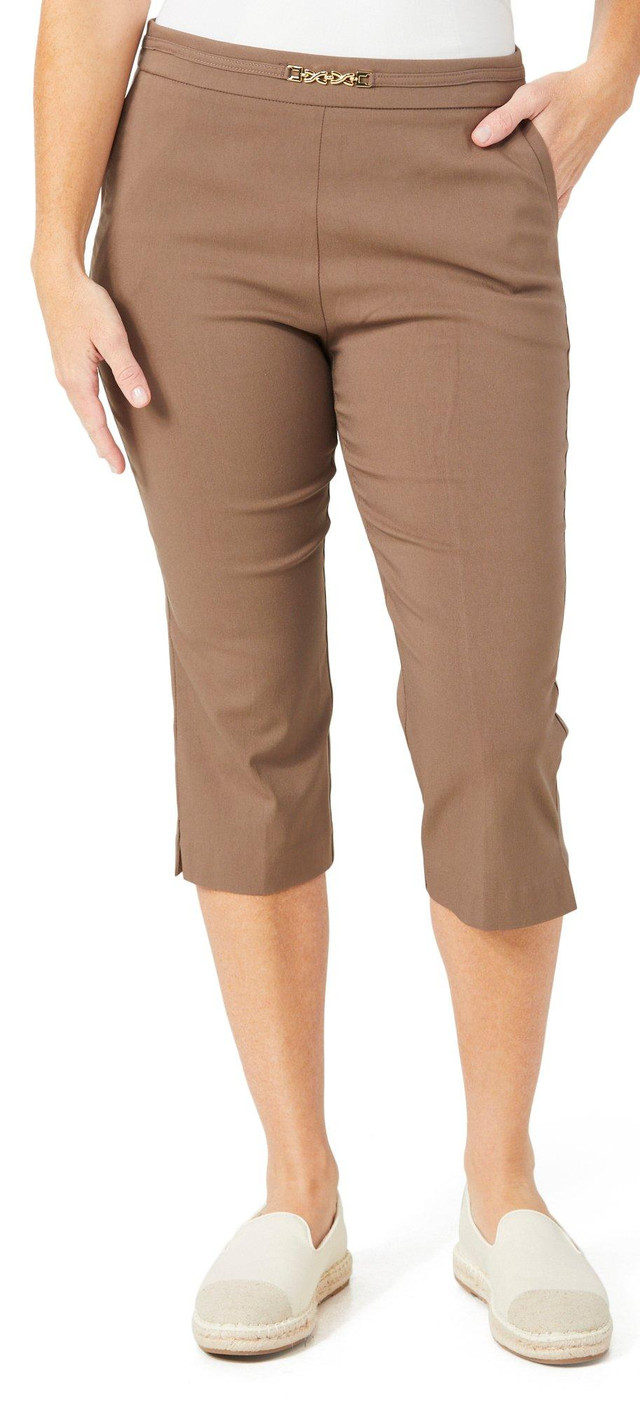 These stylish capris are ideal for your next trip out on the town, the office, and anywhere else. They feature a solid color design, flat front, and two front pockets with chain waist accents. Fabrication is 75% rayon, 22% nylon, and 3% spandex.