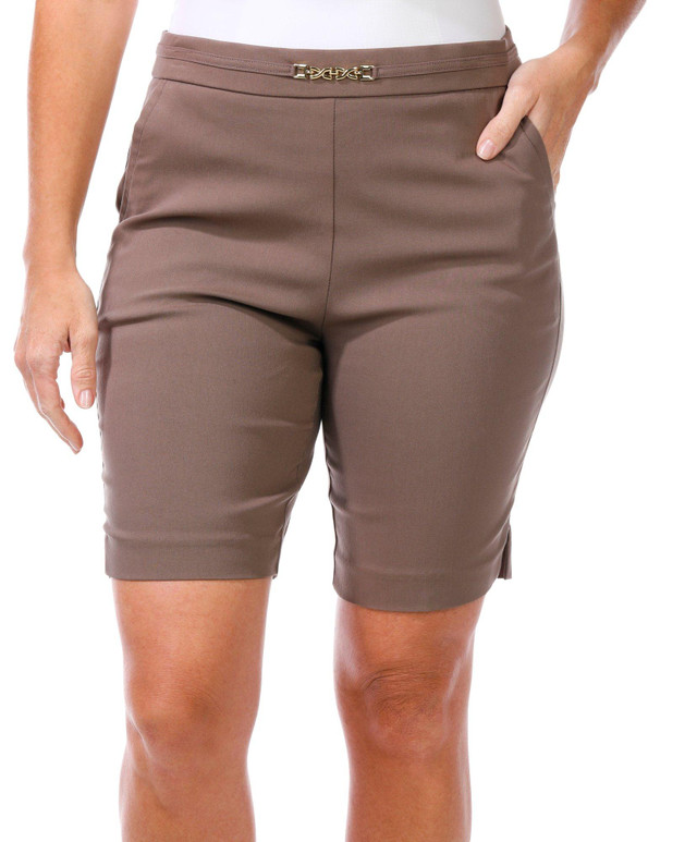 Step into effortless style with these solid color shorts made from lightweight stretch fabric that moves with you. The flat front keeps things sleek while a decorative chain detail at the waistband adds a bold twist. With an easy elastic waist and a classic fit, these 9 inch inseam shorts are your go to for polished comfort with a playful edge.