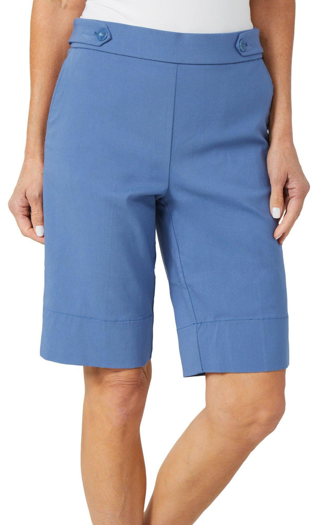 These womens Bermuda shorts feature a solid color and stretchy fabric for easy comfort. Side seam pockets add function while decorative tabs with buttons at the waist bring a polished touch to the look. Fabrication is 75% rayon, 22% nylon, and 3% spandex.