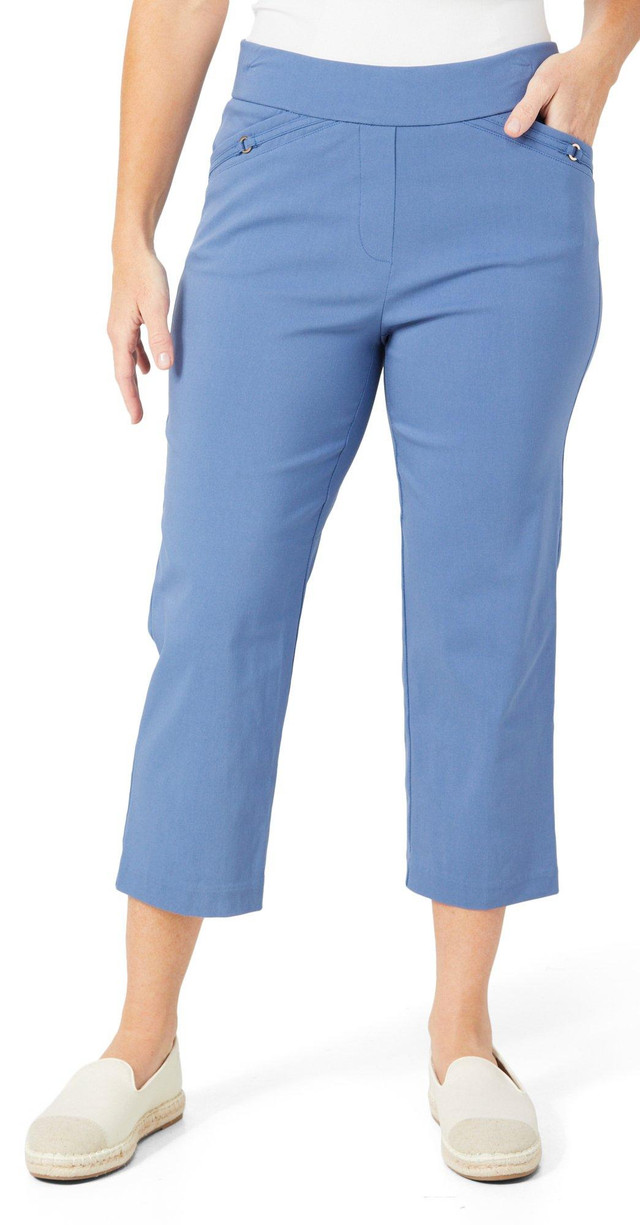 Add a playful touch to your wardrobe with these Women's Cat Eye Pocket Capris. Featuring a solid color, stylish cat eye grommet details on the front pockets, a comfy pull-on waistband, and a 23-inch inseam, they are perfect for casual days with a hint of flair. Fabrication is 75% rayon, 22% nylon, 3% spandex