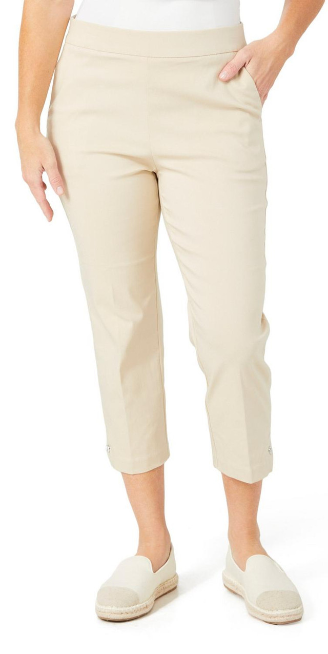 Elevate your workday style with these Women's Rhinestone Button Hem Capris. Featuring a solid color, sparkling rhinestone button detail at the hem, side pockets, and a 23-inch inseam, they blend comfort and elegance for a polished, professional look. abrication 75% rayon, 22% nylon, 3% spandex