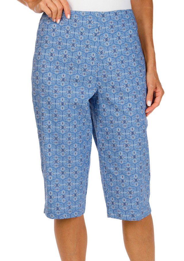 Step into summer with these blue tile print capri pants, designed for breezy comfort and effortless style. The elastic waistband offers a flexible fit, while the lightweight fabric keeps you cool on warm days. Perfect for casual outings or relaxing at home, they pair beautifully with a white tee for a fresh, laid-back look. Fabrication 75% rayon, 22% nylon, 3% spandex.