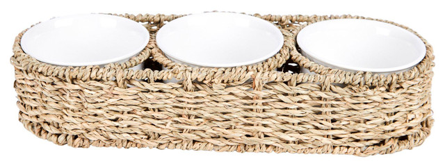 Introducing the 4 Pc Ceramic Bowl Set, a perfect blend of style and functionality. This set includes three ceramic bowls, ideal for serving dips or tidbits, and a woven basket for convenient storage. Each bowl features a sleek design that complements any table setting, while the basket adds a touch of rustic charm. Perfect for entertaining or everyday use, this set combines practicality with elegance, making it a must-have for any home.