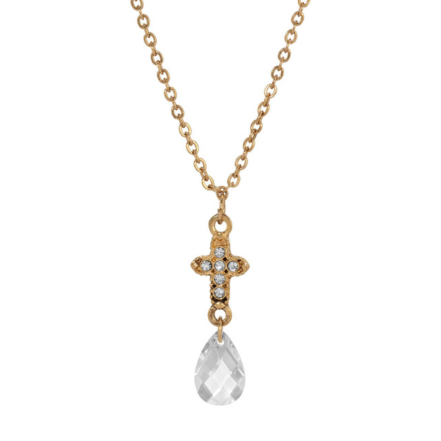 This pendant necklace is a seamless blend of spiritual symbolism and timeless sophistication. This refined pendant features a delicate cross adorned with glistening clear crystals, capturing and reflecting light with every subtle movement. Below the crystal-adorned cross, a luminous teardrop Briolette Stone hangs gracefully, creating a celestial cascade that exudes grace and femininity. Length 16 in., width 14mm.