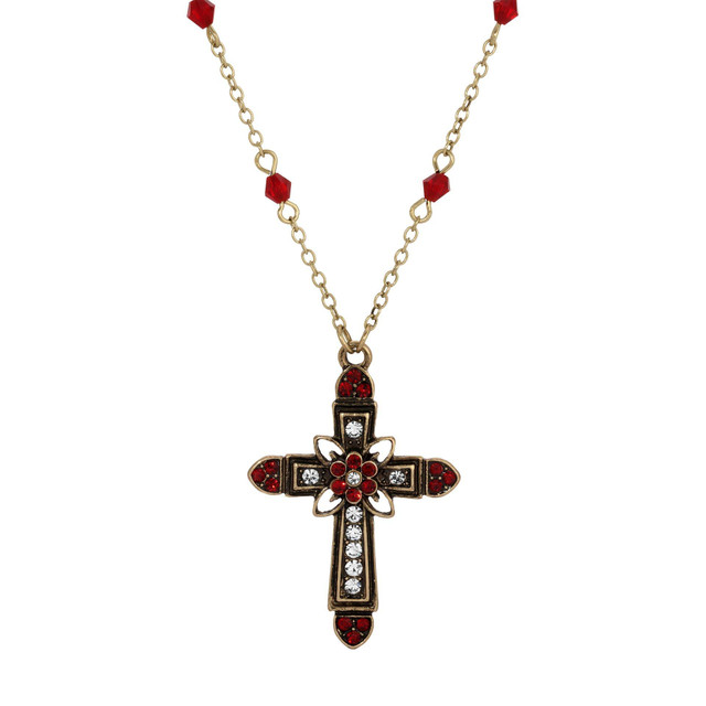 This striking cross pendant showcases a delicate floral motif at its heart, encrusted with shimmering round crystals. Suspended from a lustrous linking chain embellished with complementing colored crystals, the pendant exudes an aura of elegance and sophistication. Complete with a 3-inch extension chain and secured with a lobster clasp closure, Length 16 in., width 29mm.