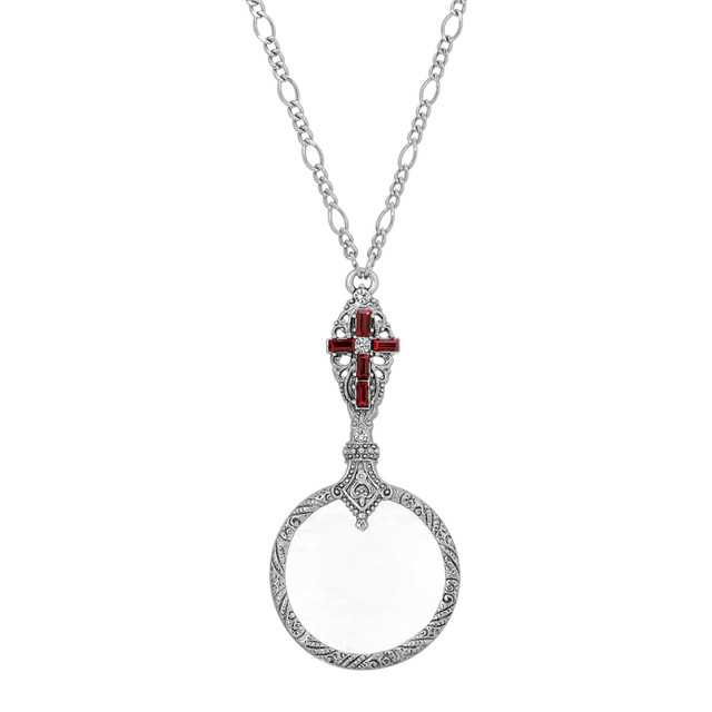 Discover the unique charm of this textured pewter magnifying glass necklace. Featuring a colored crystal stone cross with clear crystal accents, this piece is framed in intricate filigree. Its feminine design and inspirational elements make it a standout accessory, perfect for adding a touch of elegance to any outfit. Whether for everyday wear or special occasions, this necklace combines beauty and functionality in a truly distinctive way. Length 28 in., width 37mm.