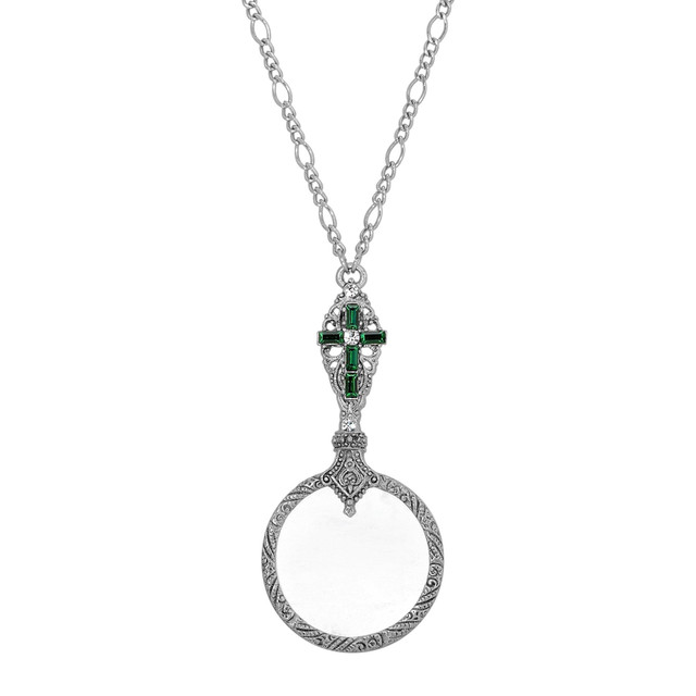 Discover the unique charm of this textured pewter magnifying glass necklace. Featuring a colored crystal stone cross with clear crystal accents, this piece is framed in intricate filigree. Its feminine design and inspirational elements make it a standout accessory, perfect for adding a touch of elegance to any outfit. Whether for everyday wear or special occasions, this necklace combines beauty and functionality in a truly distinctive way. Length 28 in., width 37mm.