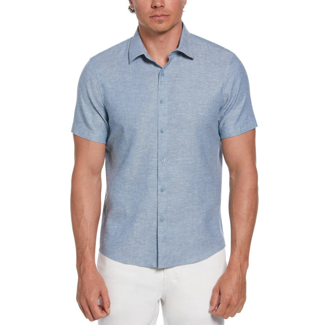 Expertly blending comfort and style, this men's short sleeve button-down shirt is sure to be a warm-weather favorite. Crafted from a durable plain weave linen-viscose blend, it offers lightweight breathability with a soft-draping feel. The subtle cross-hatch pattern adds a sophisticated touch to your smart-casual wardrobe. 45% Cotton / 55% Linen