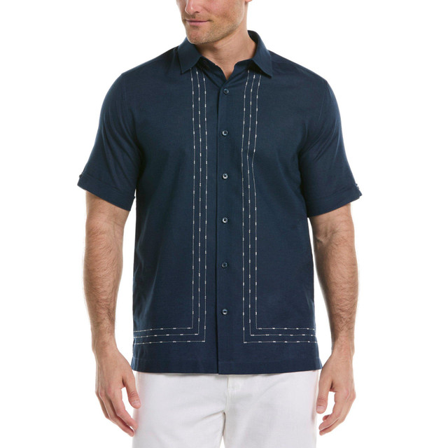 Look and feel great in this men's short sleeve shirt. Featuring a button down silhouette, point collar and embroidered panels for subtle style, this short sleeve shirt keeps your casual look elevated and on point. The linen-cotton blend fabric is breathable and easy to wear, making it a must-have for your warm weather wardrobe. 65% Cotton / 35% Linen