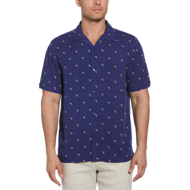 Step up your style game with this men's short sleeve button up shirt with retro-inspired details. Textured viscose fabric delivers a soft drape for easy wear, while a fun geometric print adds visual interest to your look while keeping it classic. Pair with shorts to stay cool or throw on with your favorite dress pants to for elevated casual style. A retro-cool Cuban collar finishes off this short sleeve button up you'll look and feel great in.