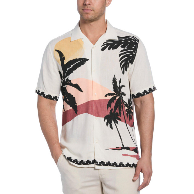 Make a standout style statement in this men's short sleeve button up shirt featuring a vibrant sunset print. Textured viscose fabric delivers a fluid cut for easy wear, while the plain weave fabrication ensures enhanced durability. This unique short sleeve button up will add fun tropical vibes to any outfit. A retro-inspired Cuban collar completes the relaxed look.