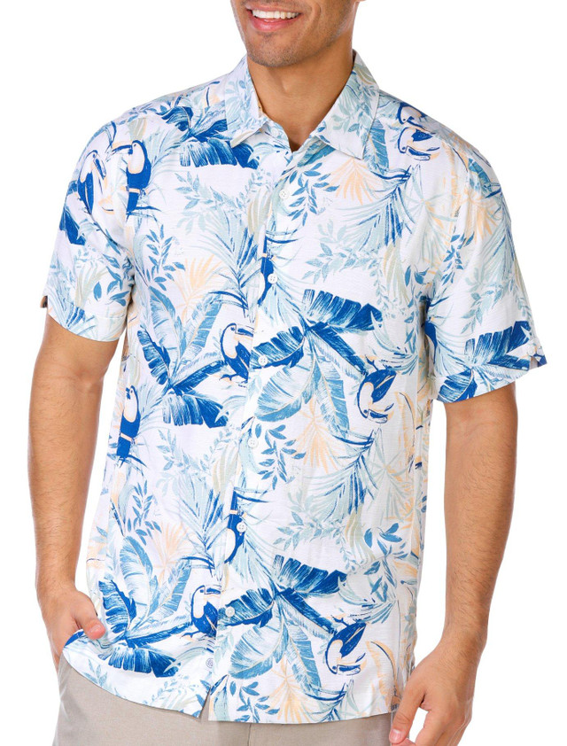 This mens short sleeve button down shirt features a cool relaxed fabric that keeps you comfortable all day. The vibrant floral toucan pattern adds a playful tropical vibe, perfect for laid back outings and sunny adventures.
