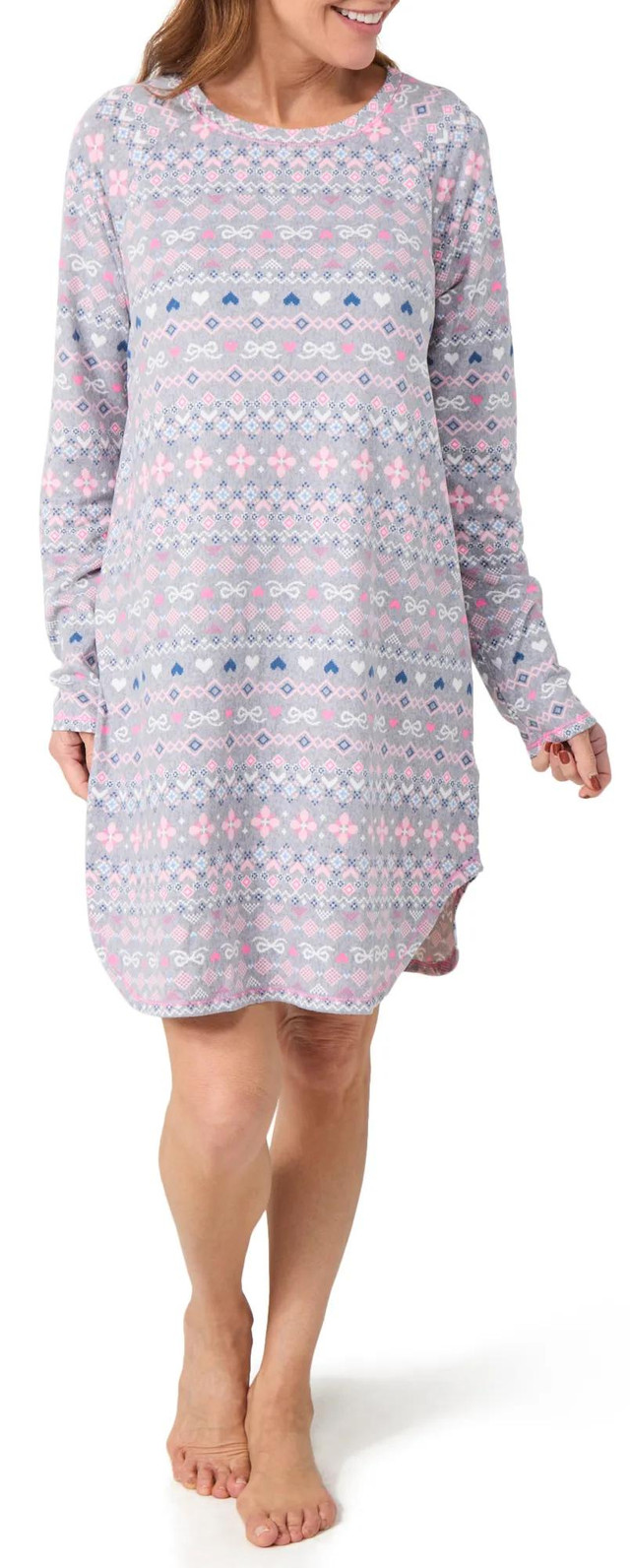 This womens long sleeve sleepshirt is made from soft, warm material and features a festive fair isle pattern. Cozy and comfortable, it adds holiday charm to relaxing nights at home. Fabrication is 95% polyester and 5% elastane.