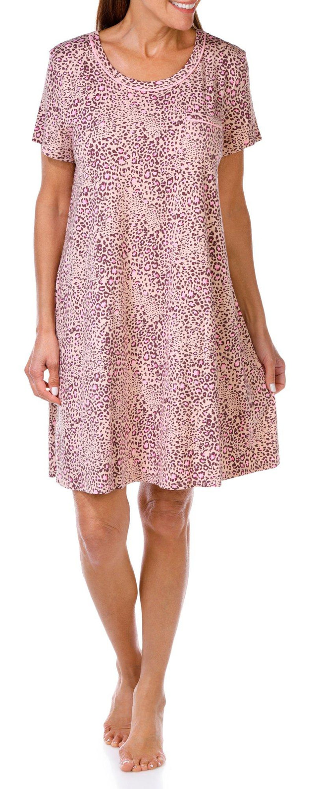 Unleash your wild side with our Womens Short Sleeve Leopard Print Sleep Shirt. Made from soft fabric, it features a bold leopard print, short sleeves, and a chest pocket for a touch of casual charm and comfort. Fabrication 57% cotton, 38% modal, 5% spandex