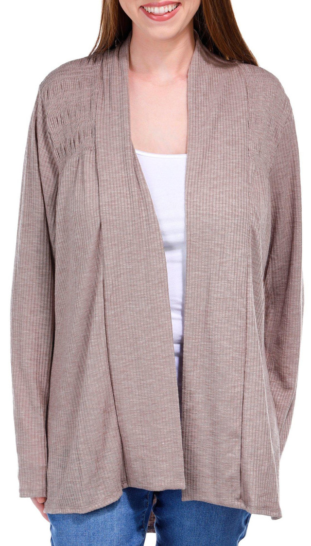 This Long Sleeve Slub Cardigan is a stylish and comfortable addition to your wardrobe. Made from ribbed fabric, it offers a cozy and textured feel. The ruched shoulder details add a touch of elegance and uniqueness to the design. Perfect for layering, this cardigan combines fashion and functionality, making it an ideal choice for any occasion. Fabrication is 65% polyester, 30% rayon, 5% spandex.