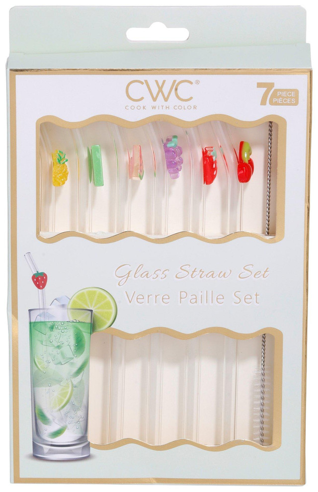 Sip sustainably with this 7-piece Glass Fruit Straw Set! Includes six reusable glass straws, each adorned with a cute fruit accent, plus a cleaning brush for easy care.