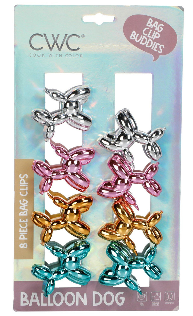 This 8 piece set of bag clips features playful balloon dog designs in metallic colors, adding fun and function to food storage. Each clip includes a magnetic backing for easy access on refrigerators or metal surfaces. Perfect for sealing snacks and organizing with personality.