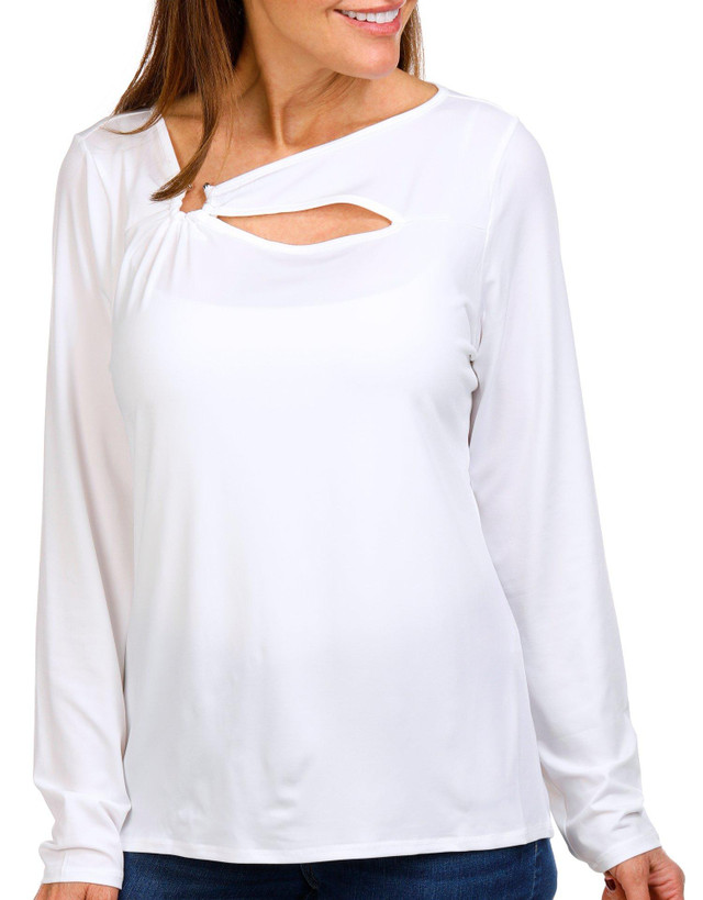 Introducing our Women's Long Sleeve Cutout Neck Top, crafted from a blend of polyester and spandex for a comfortable and flexible fit. This top features a stylish solid color that pairs effortlessly with any outfit. The cut-out asymmetrical neckline adds a modern and edgy touch, while the long sleeves provide extra coverage. Perfect for any casual or semi-formal occasion, this top combines style and comfort seamlessly.