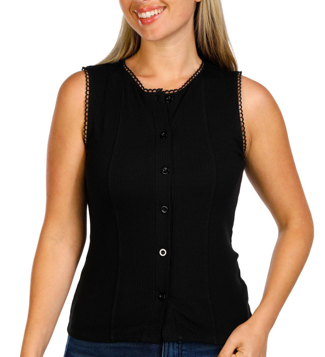 Feminine and flattering, the Womens Sleeveless Ribbed Lace Trim Top features a solid ribbed texture, button-down front, and delicate lace trim for a soft, stylish finish. Fabrication 92% rayon, 8% spandex