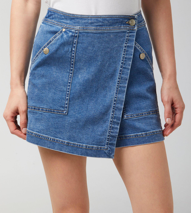 The Womens Denim Skort combines the classic look of a skirt with the comfort and coverage of shorts. Perfect for everyday wear, this versatile piece features timeless denim styling, making it easy to dress up or down. Great for staying stylish and comfortable on the go!