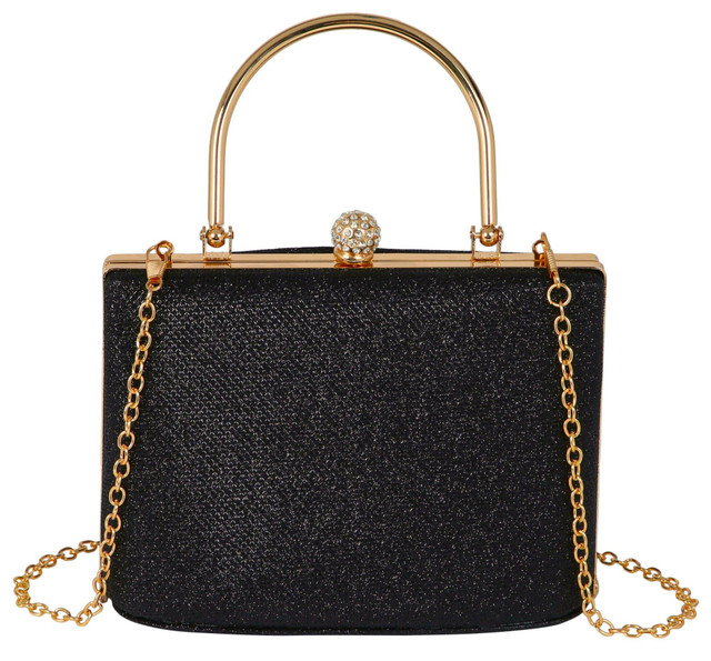This womens clutch features shiny black fabric with gold accents and a snap closure. A detachable chain allows it to be worn as a shoulder bag, and a lined interior keeps essentials organized while adding sleek, sophisticated style. Measures approximately 7 in x 5.5 x 3.5 in.