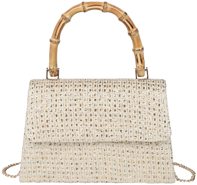This womens satchel handbag features a metallic woven grid with a distinctive bamboo handle for elevated style. The magnetic flap closure opens to an interior slip pocket for essentials, and a long detachable chain allows it to be worn as a crossbody for versatile carrying options. Measures approximately 8.5 in x 5.75 in x 2.5 in, excluding handle.