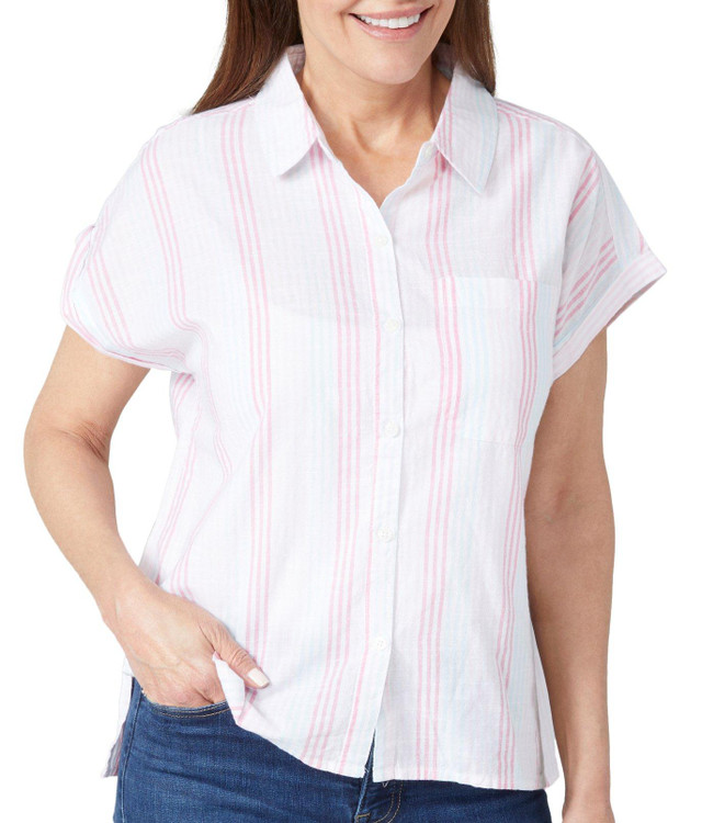 Keep it classic and cool with the Women's Short Sleeve Stripe Button Down Top. Made from 100% cotton for breathable comfort, it features a crisp collar and timeless stripe pattern. Perfect for sunny days, layering, or adding a polished touch to your casual look.