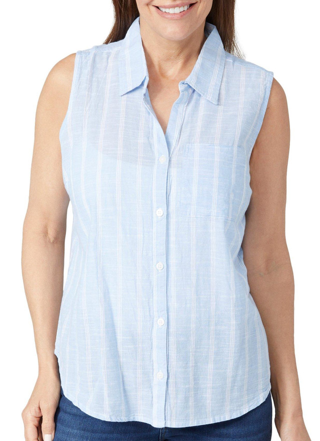 Keep it classic and cool with the Women's Sleeveless Stripe Button Down Top. Made from 100% cotton for breathable comfort, it features a crisp collar and timeless stripe pattern. Perfect for sunny days, layering, or adding a polished touch to your casual look.