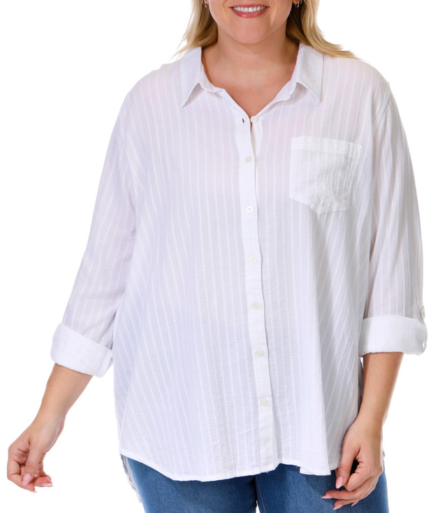 This plus size 3/4 sleeve button down top features roll tab sleeves and a soft cotton fabric for comfort. The striped pattern adds classic style, making it perfect for casual or layered outfits. Top length measures approximately 31 in. Fabrication is 100% cotton.