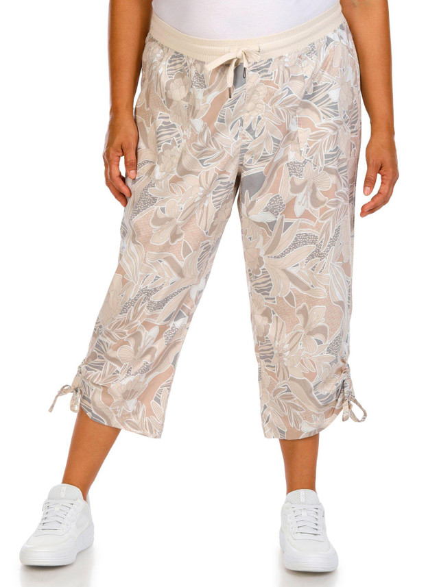 These plus size Megan floral capris feature a comfortable drawstring waistband and both side and back pockets for everyday convenience. The vibrant floral print adds a cheerful touch, perfect for casual outings or relaxed weekends. Fabrication 98% cotton, 2% spandex